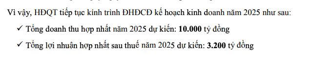 Vì vậy, Hội đồng quản trị Công ty thống nhất tiến hành triệu tập Đại hội đồng cổ đông bất thường năm 2025 lần 1 để trình Đại hội đồng cổ đông thông qua sớm các kế hoạch hoạt động trong năm 2025. Cụ thể, KBC trình kế hoạch kinh doanh năm 2025 tham vọng với tổng doanh thu hợp nhất dự kiến 10.000 tỷ đồng và lợi nhuận sau thuế 3.200 tỷ đồng, lần lượt gấp 3 lần và 7 lần so với thực hiện năm 2024.