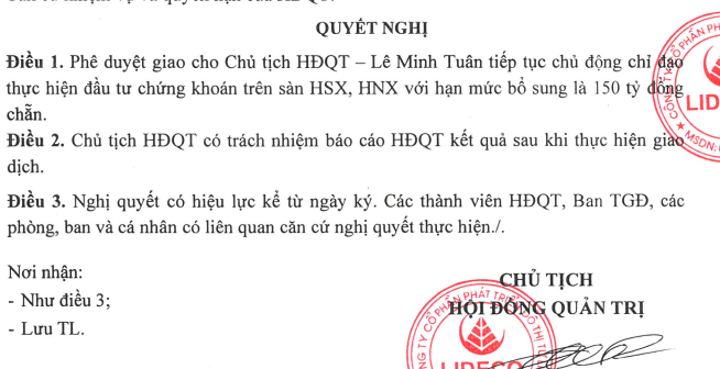 HĐQT CTCP Phát triển Đô thị Từ Liêm (Lideco, mã ck: NTL) ngày 09/03 thông qua nghị quyết giao Chủ tịch Lê Minh Tuân tiếp tục chủ động chỉ đạo hoạt động đầu tư chứng khoán trên sàn HOSE và HNX với hạn mức bổ sung 150 tỷ đồng.