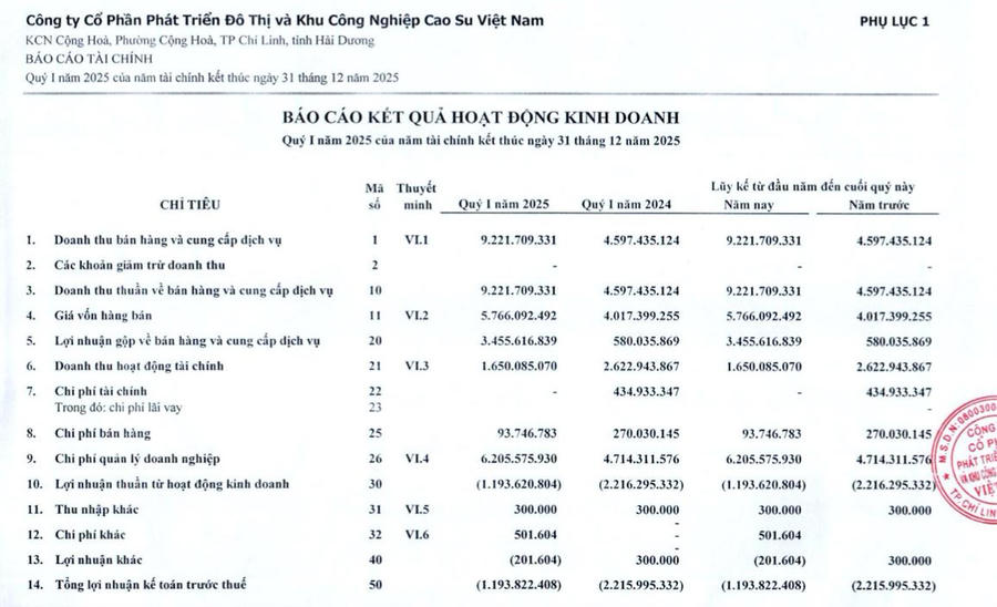 Về bức tranh tài chính, quý I/2025, VRG ghi nhận doanh thu thuần đạt 9,2 tỷ đồng, gấp 2 lần so với cùng kỳ năm ngoái. Doanh thu chủ yếu đến từ việc cho thuê lại đất gắn với hạ tầng theo các hợp đồng đã ký trước đó, chưa phát sinh hợp đồng mới trong kỳ.