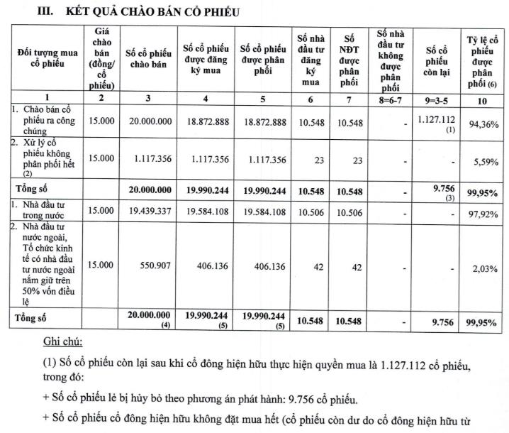 Công ty đã phát hành được 19.990.244 cổ phiếu trong tổng đăng ký chào bán 20 triệu cổ phiếu, tương ứng tỷ lệ phát hành thành công là 99,95%.