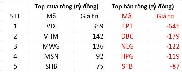Chiều bán, cổ phiếu FPT bị khối ngoại "xả" ròng đột biến với giá trị 645 tỷ đồng. Bên cạnh đó, 3 mã chứng khoán DBC, NLG và HPG cũng bị bán ròng mạnh tay trên trăm tỷ đồng, giá trị từ 119 tỷ tới 179 tỷ đồng. Ngoài ra, khối ngoại còn bán ròng khoảng 87 tỷ đồng tại STB.