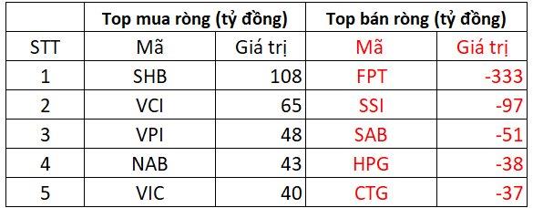 Chiều bán, cổ phiếu FPT tiếp tục là mã bị khối ngoại "xả" ròng mạnh nhất toàn thị trường với giá trị 333 tỷ đồng. Bên cạnh đó, SÍ cũng bị bán ròng khoảng 97 tỷ đồng. Các mã chứng khoán SAB, HPG và CTG cũng bị bán ròng mạnh từ 37 tới 51 tỷ đồng.