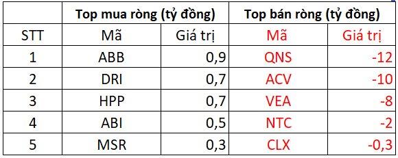 Ngược chiều, cổ phiếu QNS và ACV bị xả mạnh lần lượt 12 tỷ và 10 tỷ đồng, VEA và NTC bị bán ròng lần lượt 8 tỷ và 2 tỷ.