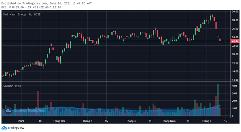 Kết thúc phiên 9/6, cổ phiếu này rơi về mức 24.100 đồng/cổ phiếu, giảm gần 17% so với đỉnh. Đà giảm có vẻ vẫn chưa dừng lại khi tạm dừng phiên sáng 10/6, DXG tiếp tục mất hơn 4% và hiện đang giao dịch ở mức 23.100 đồng/cổ phiếu. Như vậy, cổ phiếu này đã đánh mất toàn bộ thành quả tăng điểm trong nửa cuối tháng 5 chỉ sau 4 phiên giao dịch từ đầu tuần.