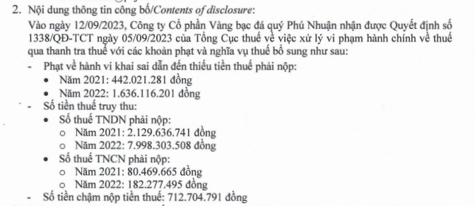 Theo kết quả thanh tra thuế, PNJ đã có hành vi khai sai dẫn đến thiếu tiền thuế phải nộp. Theo đó, Công ty bị phạt hành chính gần 2,1 tỷ đồng.