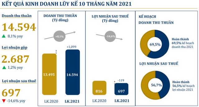 Trong cơ cấu doanh thu 10 tháng, kênh lẻ duy trì được tăng trưởng 8,6% so với cùng kỳ dù bị ảnh hưởng nghiêm trọng về hoạt động kinh doanh từ cuối quý 2 và xuyên suốt quý 3. Ở chiều ngược lại, doanh thu kênh sỉ lại giảm 5,5% so với cùng kỳ trong khi doanh thu vàng miếng tăng trưởng 15,7%.