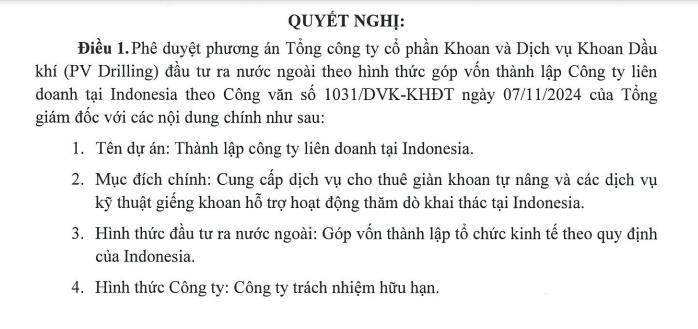 PV Drilling giao cho Tổng giám đốc quyết định, tổ chức triển khai thực hiện việc thành lập Công ty liên doanh tại Indonesia, đưa công ty vào hoạt động hiệu quả, đảm bảo tuân thủ các quy định của PV Drilling, pháp luật Việt Nam, pháp luật nước sở tại Indonesia và các quy định pháp luật có liên quan.