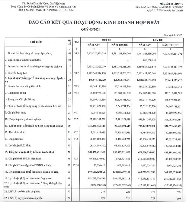 Tính chung 9 tháng đầu năm 2024, PVD ghi nhận doanh thu hợp nhất đạt 6.480,6 tỷ đồng, tăng gần 61% so với cùng kỳ năm 2023. Lợi nhuận sau thuế đạt 461 tỷ đồng, tăng gần 34%.