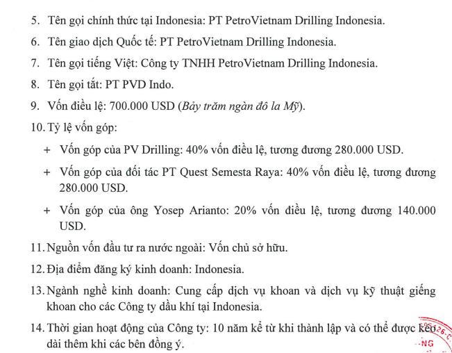 Công ty liên doanh này có tên gọi là PT PetroVietnam Drilling Indonesia (PT PVD Indo) theo hình thức công ty trách nhiệm hữu hạn, có vốn điều lệ là 700.000 USD.