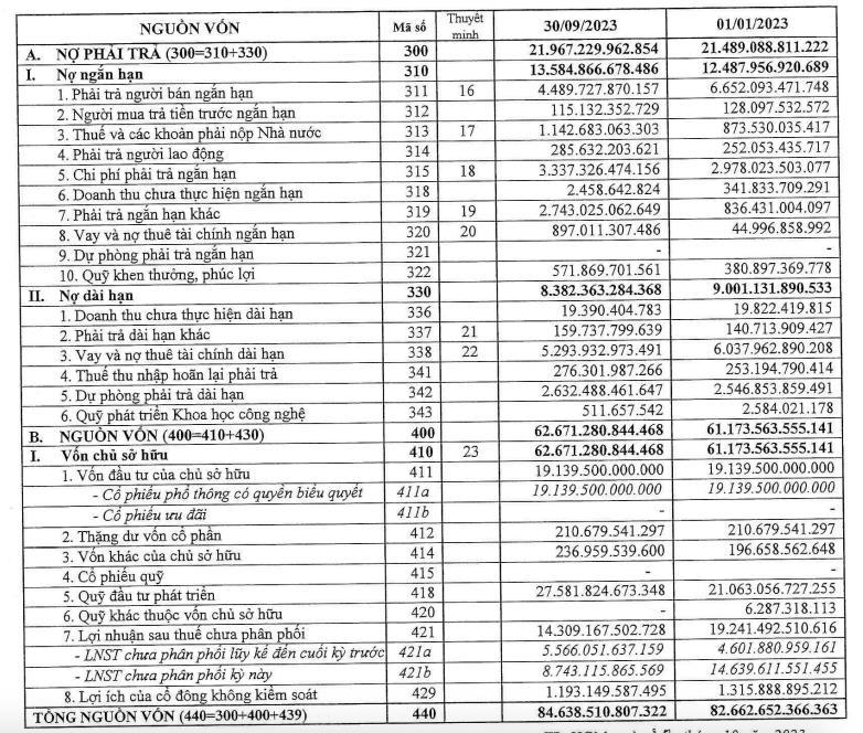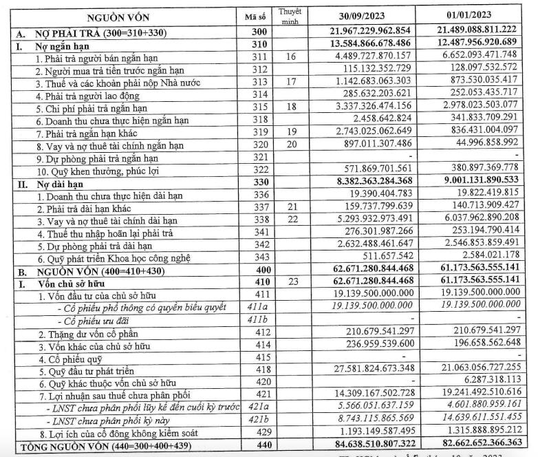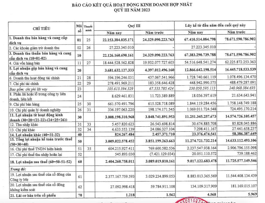 Luỹ kế 9 tháng đầu năm, công ty ghi nhận 67.383 tỷ đồng doanh thu, giảm 14% so với cùng kỳ. Lợi nhuận sau thuế đạt 9.017 tỷ đồng, giảm 23% so với 9 tháng đầu năm 2022.