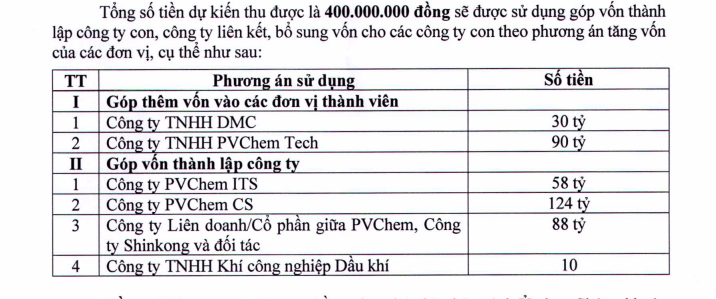 Với 400 tỷ đồng dự kiến thu được, công ty sẽ chi phần lớn để góp vốn thành lập các công ty: Công ty PVChem ITS, PV CS, Công ty liên danh/cổ phần giữa PVChem, Công ty Shinkong và đối tác...