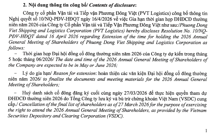 Công ty cổ phần Vận tải và Tiếp vận Phương Đông Việt (PVT Logistics, mã ck: PDV) vừa ra thông báo gia hạn thời gian tổ chức ĐHĐCĐ thường niên năm 2026.