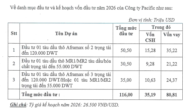 Trong đó, công ty dự kiến đầu tư 50,5 triệu USD để đầu tư 1 tàu dầu Aframax số 2 trọng tải đến 120.000 DWT; 30,5 triệu USD để đầu tư 1 tàu dầu thô MR1/MR2, tàu dầu/hoá chất trọng tải đến 55.000 DWT; và dùng 35 triệu USD đầu tư 1 tàu dầu thô Aframax số 3 trọng tải đến 120.000 DWT hoặc 1 tàu MR1/MR2 với trọng tải đến 55.000 DWT.