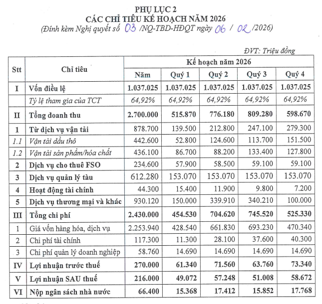 HĐQT CTCP Vận tải Dầu khí Thái Bình Dương (mã ck: PVP) vừa thông qua kế hoạch sản xuất kinh doanh năm 2026.