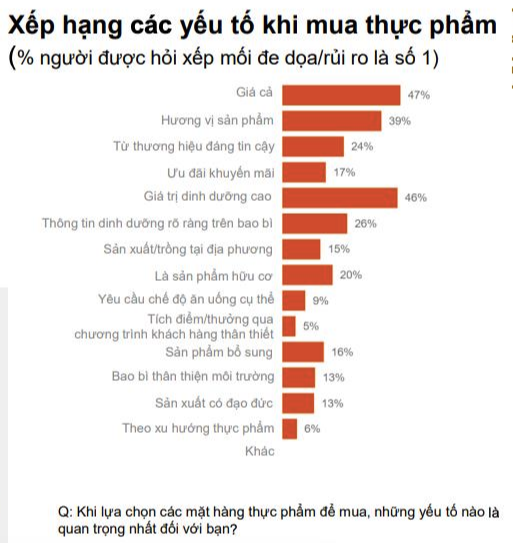 Trong bối cảnh đó, sự quan tâm đến giá cả trở thành đặc điểm nổi bật của hành vi tiêu dùng tại Việt Nam năm 2025 khi 47% người tiêu dùng Việt xếp giá cả là yếu tố hàng đầu khi mua thực phẩm, gần tương đương với mức trung bình của khu vực Châu Á – Thái Bình Dương là 50%.