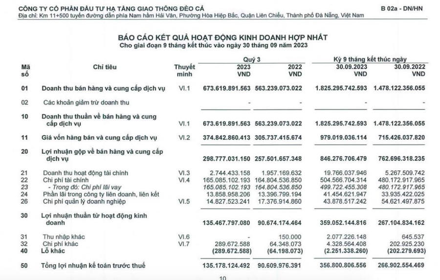Về bức tranh tài chính, lũy kế 9 tháng đầu năm, HHV ghi nhận doanh thu đạt 1.825,2 tỷ đồng, tăng 24% so với cùng kỳ. Lãi ròng của HHV đạt 268,4 tỷ đồng, tăng 26% so với 9 tháng đầu năm ngoái. Lợi nhuận sau thuế đạt 309,2 tỷ đồng, tăng 28% so với cùng kỳ.