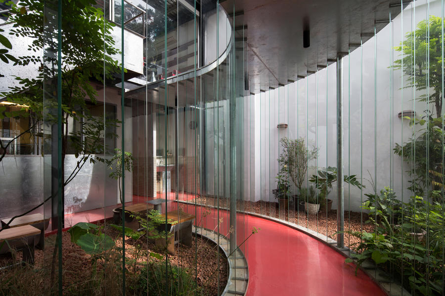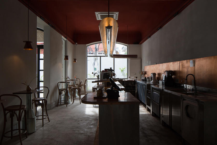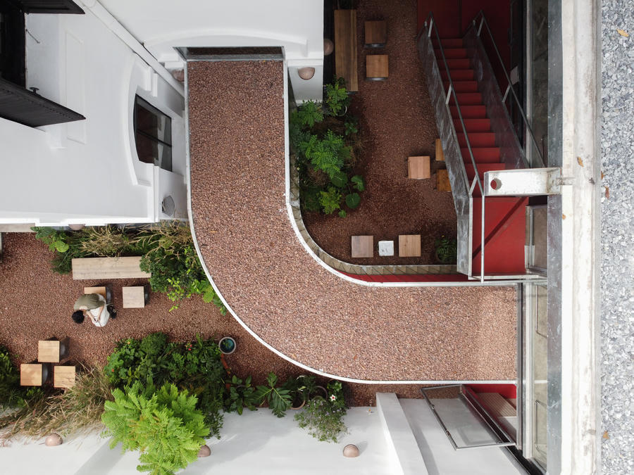 Không gian quán bao gồm biệt thự phía trước, một dãy nhà hai tầng mới ở phía sau và một khu vườn mở rộng tầm nhìn. Ranh giới giữa cái cũ và cái mới được luân phiên uyển chuyển từ lối đi, các bức tường gạch xám hay khung cửa sổ, tay vịn ban công.
