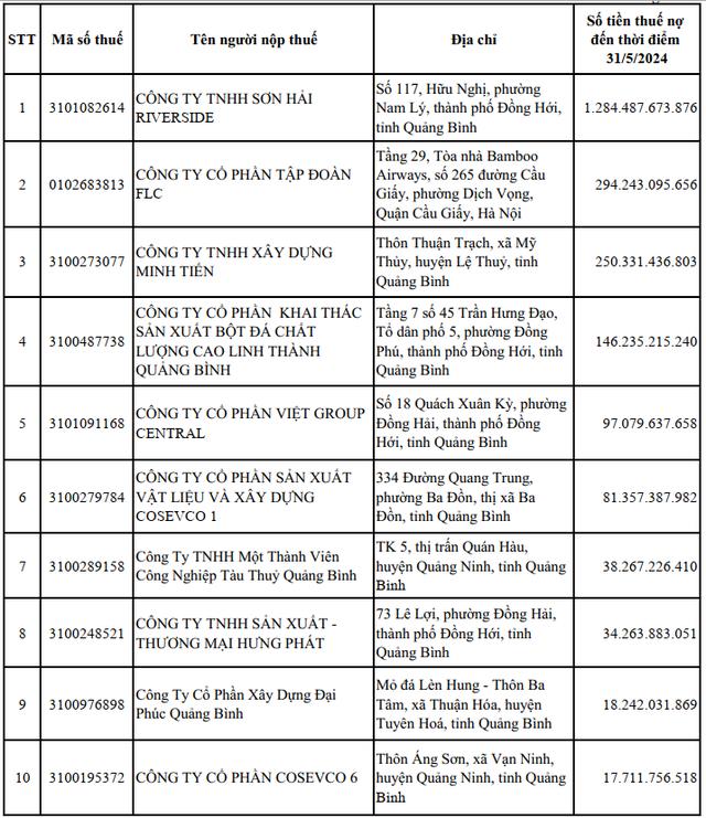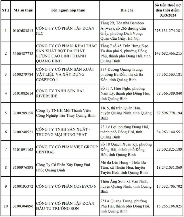 Đồng thời, cũng có một số doanh nghiệp vẫn nợ thuế ở mức cao như Tập đoàn FLC nợ thuế 294 tỷ đồng, CTCP Khai thác sản xuất bột đá chất lượng cao Linh Thành Quảng Bình nợ thuế 146 tỷ đồng, CTCP Sản xuất vật liệu và xây dựng Cosevco 1 nợ thuế 81 tỷ đồng.