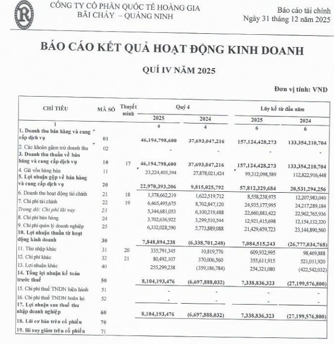 CTCP Quốc tế Hoàng Gia (mã ck: RIC) vừa công bố kết quả kinh doanh quý IV/2025 và cả năm 2025.