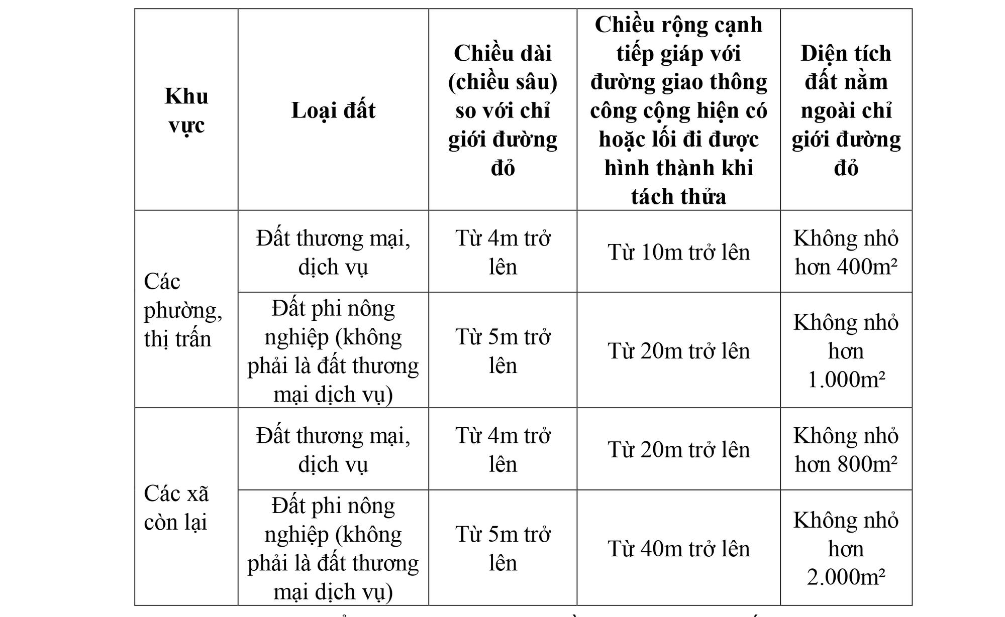 Trong đó quy định điều kiện, diện tích tối thiểu của việc tách thửa đất, hợp thửa đất (thực hiện khoản 4 Điều 220 Luật Đất đai).