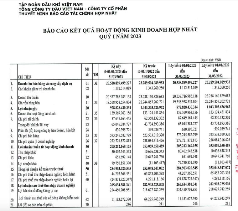 Báo cáo tài chính hợp nhất quý I/2023 của Tổng công ty Dầu Việt Nam (PV OIL - mã ck: OIL) ghi nhận doanh thu thuần đạt 20.538 tỷ đồng, giảm 12% so với cùng kỳ năm ngoái.