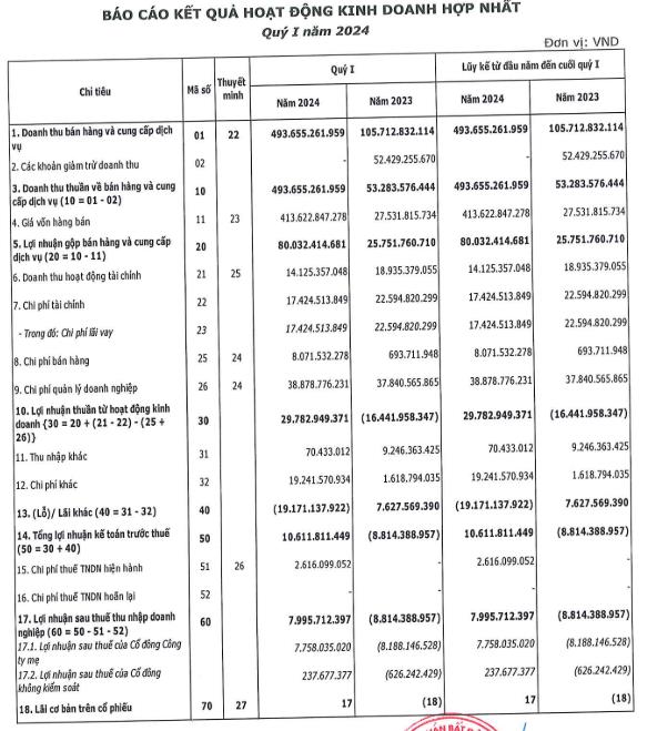 Theo báo cáo, trong Quý I/2024, CenLand ghi nhận doanh thu đạt 493,66 tỷ đồng (tăng 826% so với cùng kỳ), lợi nhuận gộp bán hàng và cung cấp dịch vụ đạt 80 tỷ (tăng 67% so với cùng kỳ), lợi nhuận thuần từ hoạt động kinh doanh đạt 29,7 tỷ (tăng 46,1 tỷ so với cùng kỳ lỗ 16,4 tỷ), lợi nhuận sau thuế ghi nhận lãi 8 tỷ đồng (tăng 16,8 tỷ đồng so với cùng kỳ lỗ 8,8 tỷ đồng).