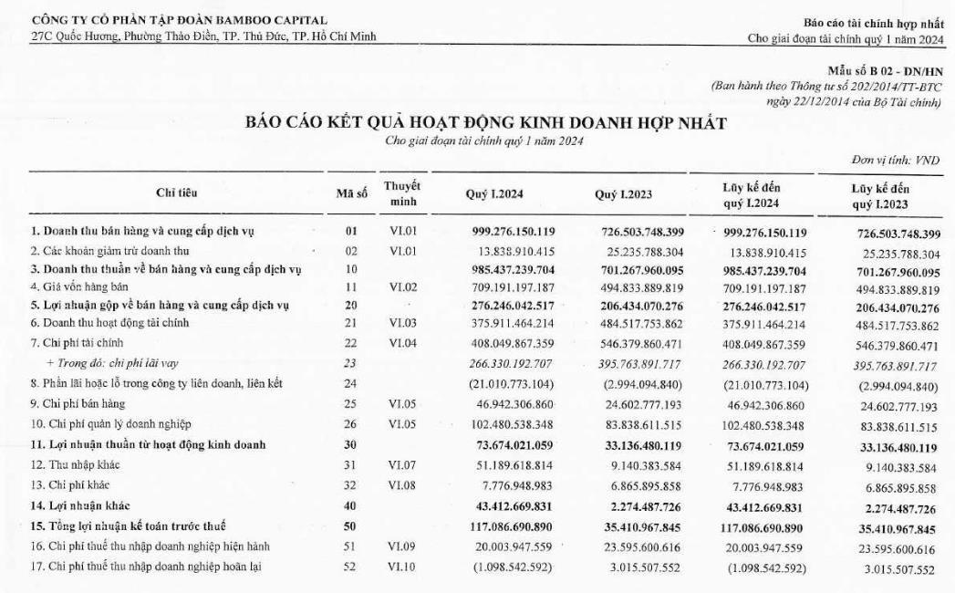 Tập đoàn Bamboo Capital (mã ck: BCG) vừa công bố báo cáo tài chính hợp nhất quý I/2024 với doanh thu thuần đạt 985,4 tỷ đồng, tăng 40% so với cùng kỳ năm 2023.
