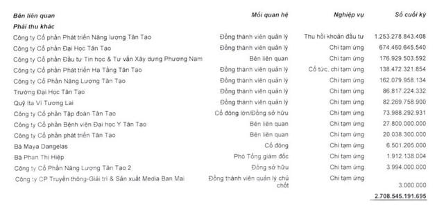 Trong đó, Tân Tạo đang có phải thu khác giá trị 2.708,5 tỷ đồng của bên liên quan. Trong đó, 1.253,3 tỷ đồng CTCP Phát triển Năng lượng Tân Tạo; 674,46 tỷ đồng chi tạm ứng CTCP Đại học Tân Tạo; chi tạm ứng 6,5 tỷ đồng cho bà Maya Dangelas, Chủ tịch HĐQT Tân Tạo …