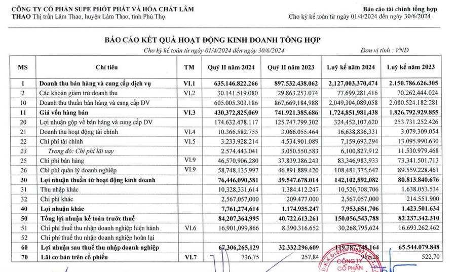 Tính chung 6 tháng đầu năm, Công ty Supe Lâm Thao ghi nhận doanh thu thuần vượt mốc 2.000 tỷ đồng, giảm 2% so với cùng kỳ. Tuy nhiên cấu trúc giá vốn hợp lý hơn giúp lợi nhuận sau thuế đạt 120 tỷ đồng, tăng 83% so với cùng kỳ.