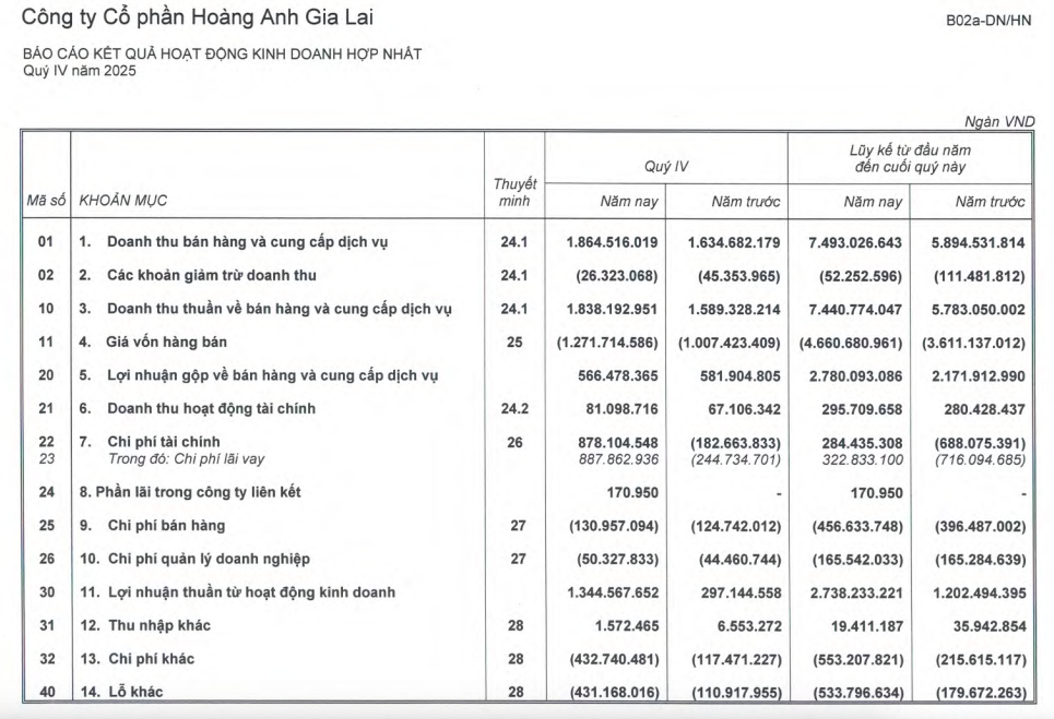 Lũy kế cả năm 2025, HAGL đạt doanh thu thuần 7.440 tỷ đồng, tăng gần 29% so với năm trước. Lợi nhuận sau thuế đạt 2.243 tỷ đồng, gấp đôi cùng kỳ và là mức cao kỷ lục kể từ khi doanh nghiệp đi vào hoạt động.
