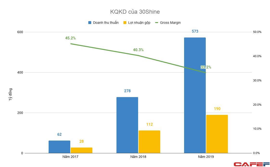 Theo dữ liệu của chúng tôi, quy mô doanh thu của 30Shine tăng trưởng hết sức ấn tượng trong hai năm gần đây. Năm 2018 gấp 4,5 lần đạt 278 tỷ đồng, năm 2019 vẫn tăng gấp đôi lên 573 tỷ đồng, cho dù quy mô đã lớn hơn rất nhiều.