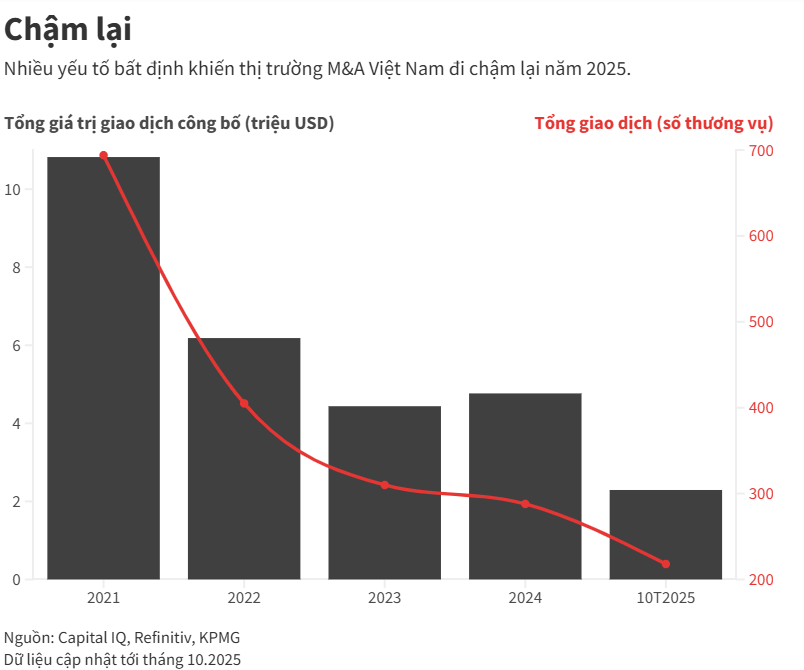 Dữ liệu tổng hợp từ KPMG cho thấy tổng giá trị giao dịch M&A tại Việt Nam trong 10 tháng đầu năm 2025 đạt 2,3 tỷ USD, giảm 52% so với năm trước. Sự điều chỉnh về quy mô dòng vốn đánh dấu quá trình thiết lập mặt bằng giá mới, tạo dư địa đàm phán cho bên mua trong việc lựa chọn các tài sản chất lượng cao vào chu kỳ 2026.