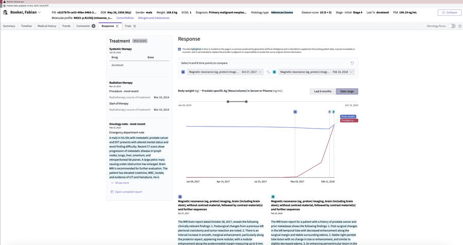 Tiến sĩ Taha Kass-Hout, giám đốc khoa học và công nghệ toàn cầu của GE HealthCare cho biết, ứng dụng CareIntellect for Oncology có thể tóm tắt lâm sàng và xác định khi nào bệnh nhân chệch khỏi phác đồ điều trị.