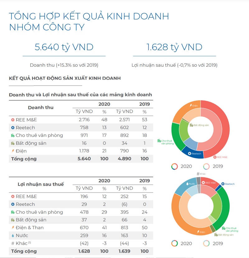 Năm 2020 REE đã hoàn tất công cuộc tái cấu trúc, trong đó thành lập các pháp nhân mới tại 3 mảng bất động sản, năng lượng, nước và chuyển nhượng vốn tại các công ty liên quan về. Kết thúc năm 2020, Công ty đạt 5.600 tỷ doanh thu, tăng 15,5%. Lợi nhuận sau thuế đạt 1.628 tỷ đồng, giảm nhẹ 10 tỷ đồng so với cùng kỳ và suýt soát kế hoạch.