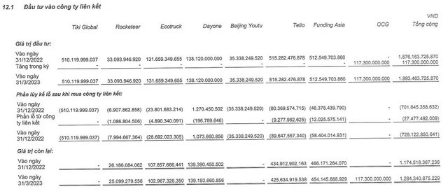 Về danh sách các khoản đầu tư vào Công ty liên kết, Công ty tiếp tục lỗ 27,5 tỷ đồng trong quý I/2023. Trong đó, chủ yếu lỗ 12,03 tỷ đồng Công ty Funding Asia; lỗ 9,3 tỷ đồng Telio; lỗ 4,89 tỷ đồng Ecotruck; lỗ 1,09 tỷ đồng Rocketeer; và lỗ 0,2 tỷ đồng Dayone.