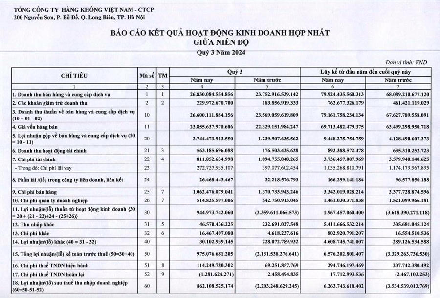 Về kết quả kinh doanh, theo báo cáo tài chính hợp nhất quý III/2024, HVN ghi nhận doanh thu thuần đạt 26.600 tỷ đồng, tăng hơn 3.031 tỷ đồng (tương đương 12,8%) so với cùng kỳ năm ngoái.