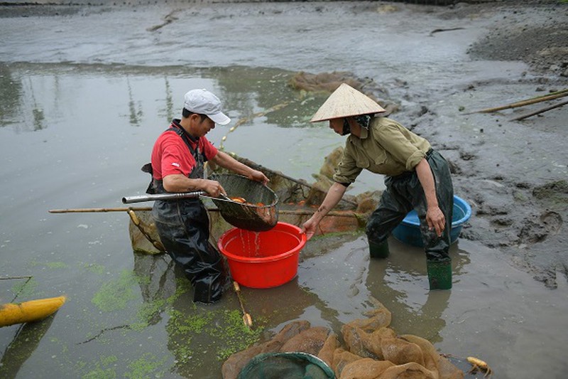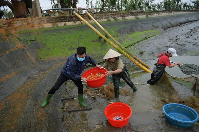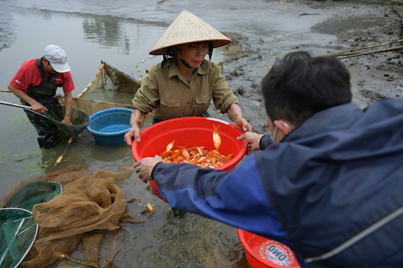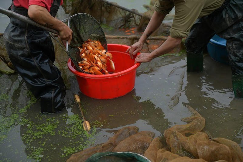 Cận Tết ông Công ông Táo, hàng trăm hộ ở làng Thủy Trầm (xã Tuy Lộc, huyện Cẩm Khê, Phú Thọ) tất bật thu hoạch cá chép đỏ, phục vụ nhu cầu người dân.
