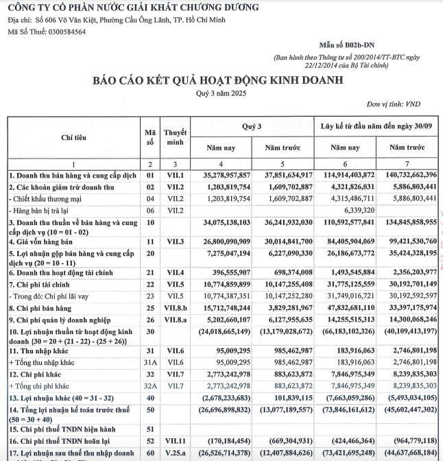 CTCP Nước giải khát Chương Dương (Sá xị Chương Dương, mã ck: SCD) mới đây công bố báo cáo kinh doanh quý III/2025 với kết quả ảm đạm.