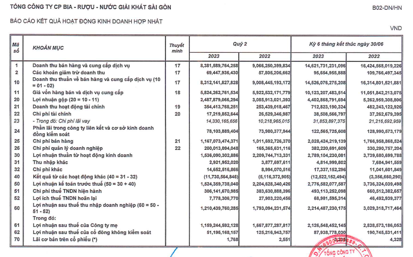 Về kết quả kinh doanh, quý II/2023, SAB ghi nhận doanh thu thuần đạt 8.312 tỷ đồng, giảm 8% so với cùng kỳ. Trừ đi chi phí giá vốn, lợi nhuận gộp công ty đạt 2.487,8 tỷ đồng, giảm 19% so với cùng kỳ.