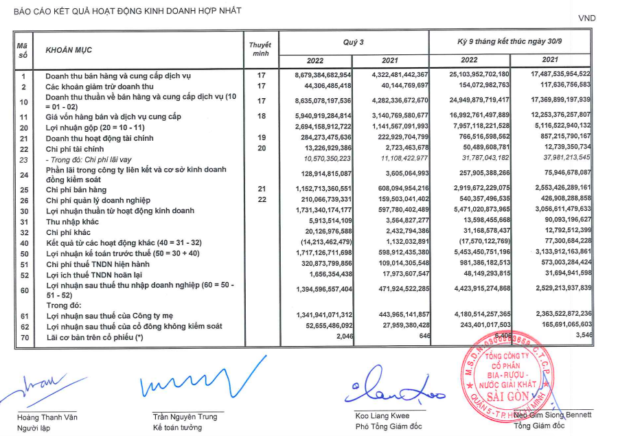 Theo giải trình từ đại diện Sabeco, trong 9 tháng đầu năm 2022, doanh thu và lợi nhuận ròng đã cải thiện và cao hơn năm ngoái khi cả nước đã thoát khỏi tình trạng ngừng hoạt động. Nhiều chương trình hỗ trợ bán hàng cũng như các chương trình tiếp thị cũng giúp thúc đẩy các hoạt động bán hàng cho các nhãn hàng.