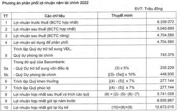 Lợi nhuận trước thuế 2022 trên BCTC hợp nhất của Sacombank là 6.339 tỷ đồng. Lợi nhuận sử dụng để phân phối gần 4.705 tỷ đồng.
