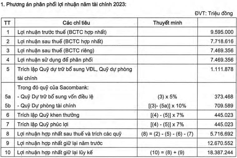 Tuy nhiên, theo phương án phân phối lợi nhuận năm tài chính 2023, sau khi trừ đi thuế và trích lập các quỹ, lợi nhuận còn lại năm ngoái của Sacombank là 5.717 tỷ đồng. Lợi nhuận giữ lại các năm trước là 12.671 tỷ đồng. Như vậy, tổng lợi nhuận giữ lại lũy kế của Ngân hàng đang ở mức 18.387 tỷ đồng. Nhưng không khác ở các năm trước đó, Sacombank tiếp tục không có kế hoạch chia cổ tức cho các cổ đông. Tính đến cuối năm 2023, vốn điều lệ của ngân hàng này đạt 18.852 tỷ đồng.