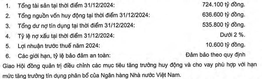 Đồng thời, mục tiêu đến cuối năm 2024, tổng tài sản dự kiến ở mức 724.100 tỷ đồng, tăng 10%, trong đó dư nợ tín dụng đạt 535.800 tỷ đồng, tăng 11% và sẽ được điều chỉnh phù hợp với hạn mức phân bổ. Nguồn vốn huy động dự kiến ở mức 636.600 tỷ đồng, cao hơn 10% so với cuối năm ngoái, trong khi tỷ lệ nợ xấu được kiểm soát dưới 2%. Các giới hạn, tỷ lệ đảm bảo an toàn tuân thủ theo quy định của NHNN.