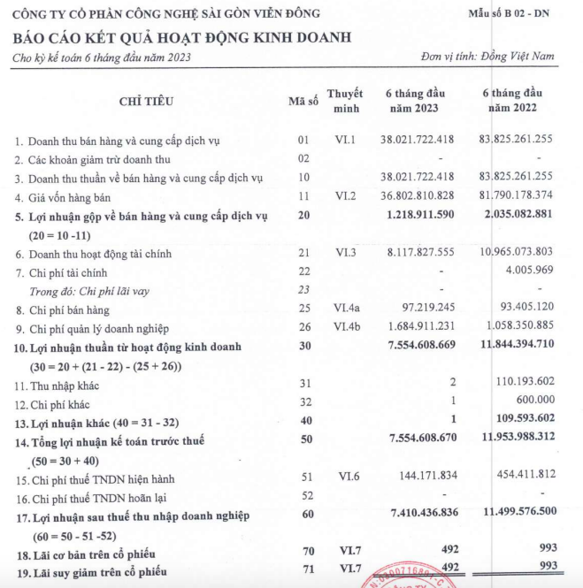 Về tình hình kinh doanh, theo báo cáo tài chính hợp nhất quý II/2023 đã soát xét, Sài Gòn Viễn Đông ghi nhận doanh thu 6 tháng đầu năm đạt 38 tỷ đồng doanh thu thuần, và 7,4 tỷ đồng lợi nhuận sau thuế, lần lượt giảm 55% và 36% so với cùng kỳ năm trước. Lợi nhuận trước thuế ghi nhận tại 7,5 tỷ đồng, giảm mạnh so với con số 11,8 tỷ đồng đạt được ở cùng kỳ năm 2022.
