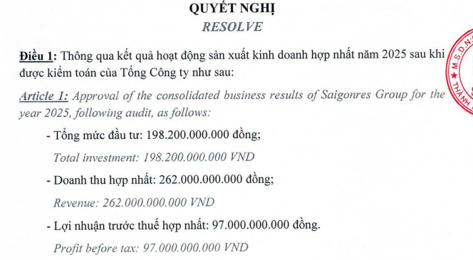 Về kết quả kinh doanh hợp nhất sau kiểm toán năm 2025, SGR cho biết doanh thu hợp nhất đạt 262 tỷ đồng, lãi trước thuế hợp nhất đạt 97 tỷ đồng. Tổng mức đầu tư trong năm 2025 đạt 198,2 tỷ đồng.