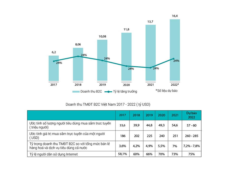 TMĐT giữa doanh nghiệp với các cá nhân (B2C) Việt Nam đã tăng trưởng khoảng 20%,đạt mốc 16,4% tỷ USD, chiếm gần 6% tổng mức tiêu chuẩn hàng hóa và dịch vụ tiêu dùng cả nước. Dự báo, năm 2023, TMĐT sẽ tiếp tục phát triển và tạo ra những xu hướng tiêu dùng mới và đến năm 2025, quy mô TMĐT Việt Nam có thể đạt 52 tỷ USD, trở thành nền kinh tế có thị trường TMĐT đứng thứ 3 khu vực ASEAN.Về phía người tiêu dùng, theo báo cáo Thời gian truy cập Internet trung bình 6 giờ 38 phút đứng thứ 9 trên thế giới.