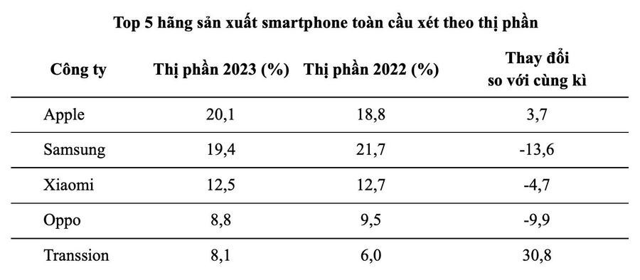 Cũng theo báo cáo của IDC, theo sau Apple và Samsung về thị phần điện thoại toàn cầu là ba nhà sản xuất smartphone đến từ Trung Quốc, bao gồm Xiaomi (chiếm 12,5%), Oppo (chiếm 8,8%), và Transsion (chiếm 8,1%).
