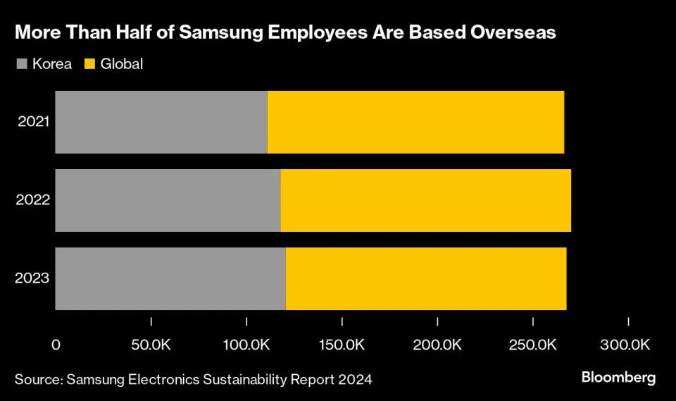 Theo báo cáo phát triển bền vững mới nhất, Samsung có hơn một nửa số nhân viên làm việc ở nước ngoài. Người phát ngôn của Samsung cho biết: "Một số công ty con ở nước ngoài đang tiến hành điều chỉnh lực lượng lao động thường xuyên để cải thiện hiệu quả hoạt động". Công ty chưa đặt mục tiêu cho bất kỳ vị trí cụ thể nào".