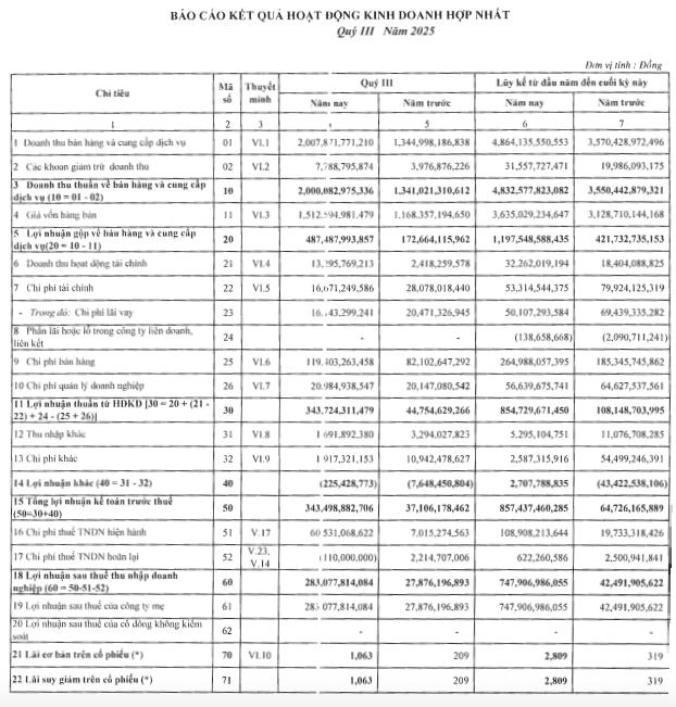 Theo báo cáo tài chính kinh doanh hợp nhất quý III/2025, Công ty cổ phần Nam Việt (Navico, mã ck: ANV) ghi nhận doanh thu thuần hơn 2.000 tỷ đồng, tăng 52% so với cùng kỳ. Giá vốn tăng chậm hơn giúp lãi gộp tăng vọt 182% lên 487 tỷ đồng.