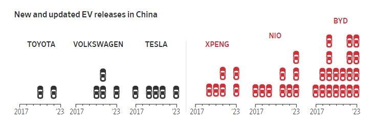 Khi nhu cầu xe điện suy giảm, các nhà sản xuất ô tô Trung Quốc có thêm động lực để cập nhật và tung ra các mẫu xe mới. Vì người Trung Quốc có xu hướng thích xe mới, hoặc dòng xe đời mới, nên xe có thời gian sử dụng ngắn. Theo phân tích của công ty tư vấn AlixPartners, các nhà sản xuất xe điện Trung Quốc tung ra các mẫu xe bán trong thời gian trung bình là 1,3 năm.